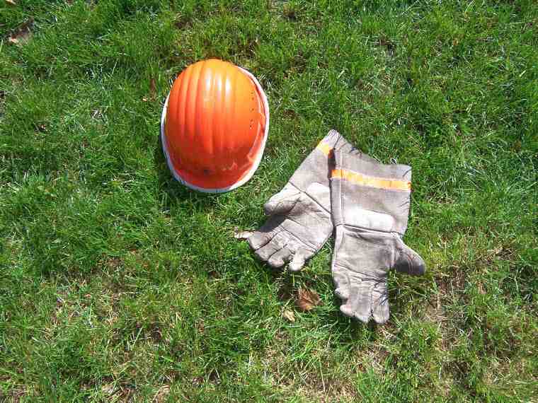 Beim Arbeiten tragen wir weiße Lederhandschuhe, die es nur in Einheitsgröße gibt, und die rote Aufschrift „Feuerwehr“ tragen.