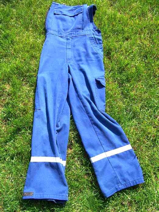 Die Latzhose ist dunkelblau und hat an den Beinen silberne Reflektorstreifen angebracht. Ausserdem befinden sich an den Beinen seitlich jeweils eine kleine Tasche und eine grosse Tasche in Brustkorbhöhe. Die Latzhose wird von uns eigentlich zu allen Anlässen getragen, so z.B. an den Übungsabenden oder an Feuerwehrbällen.