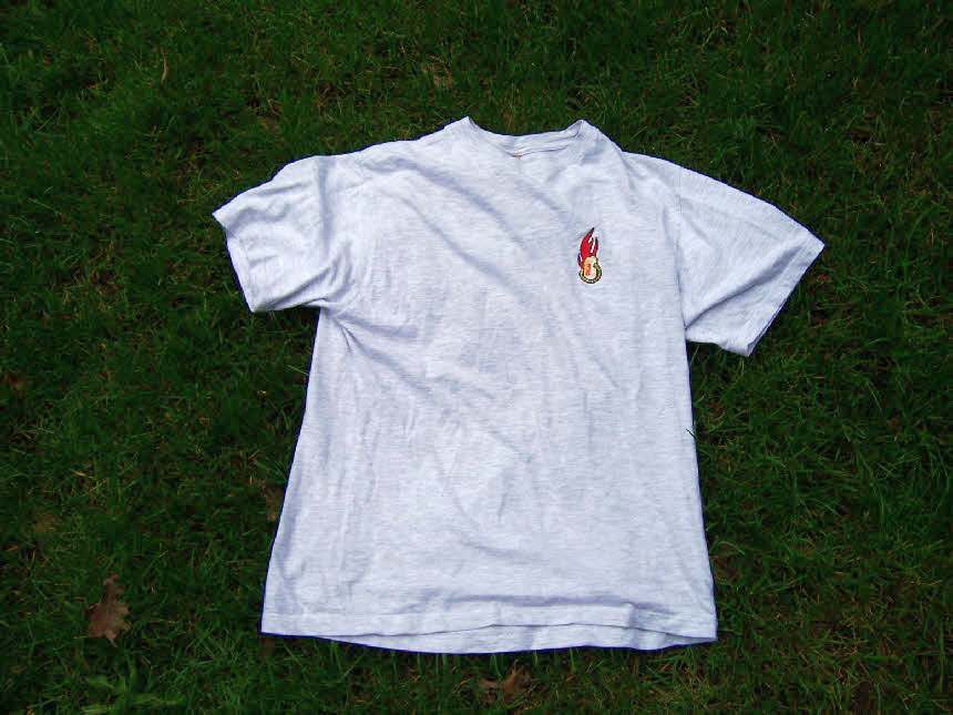 Die graumelierten T-Shirts haben ebenfalls auf der linken Brusttasche das Emblem des Deutschen Jugendfeuerwehr Verband. Die T-Shirts werden bei besonderen Sonderdiensten oder Jubiläen unter der Ausgehjacke getragen.