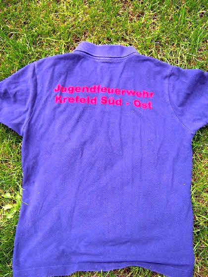 Die aus eigenen Mitteln angeschafften, dunkelblauen Polo-Shirt liessen wir Brustseitig mit dem Emblem des Deutschen Jugendfeuerwehr Verbandes besticken und auf dem Rücken die rote Aufschrift "Jugendfeuerwehr Krefeld Süd - Ost" beflocken.